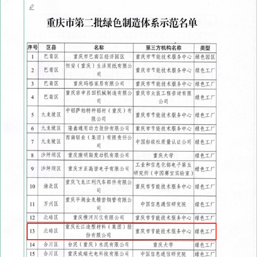 2019年9月,长江材料列入重庆市经信委第二批绿色制造体系示范单位。2020年10月,长江材料列入国家工业和信息化部列入第五批绿色工厂。